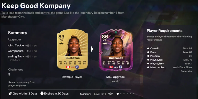 The EA FC 26 Keep Good Kompany Evolution has five levels, just like the recently released Little Magician EVO. Players must complete the following challenges in the Ultimate Team game mode, such as Rush, Rivals, or Champions, to receive the following rewards:
